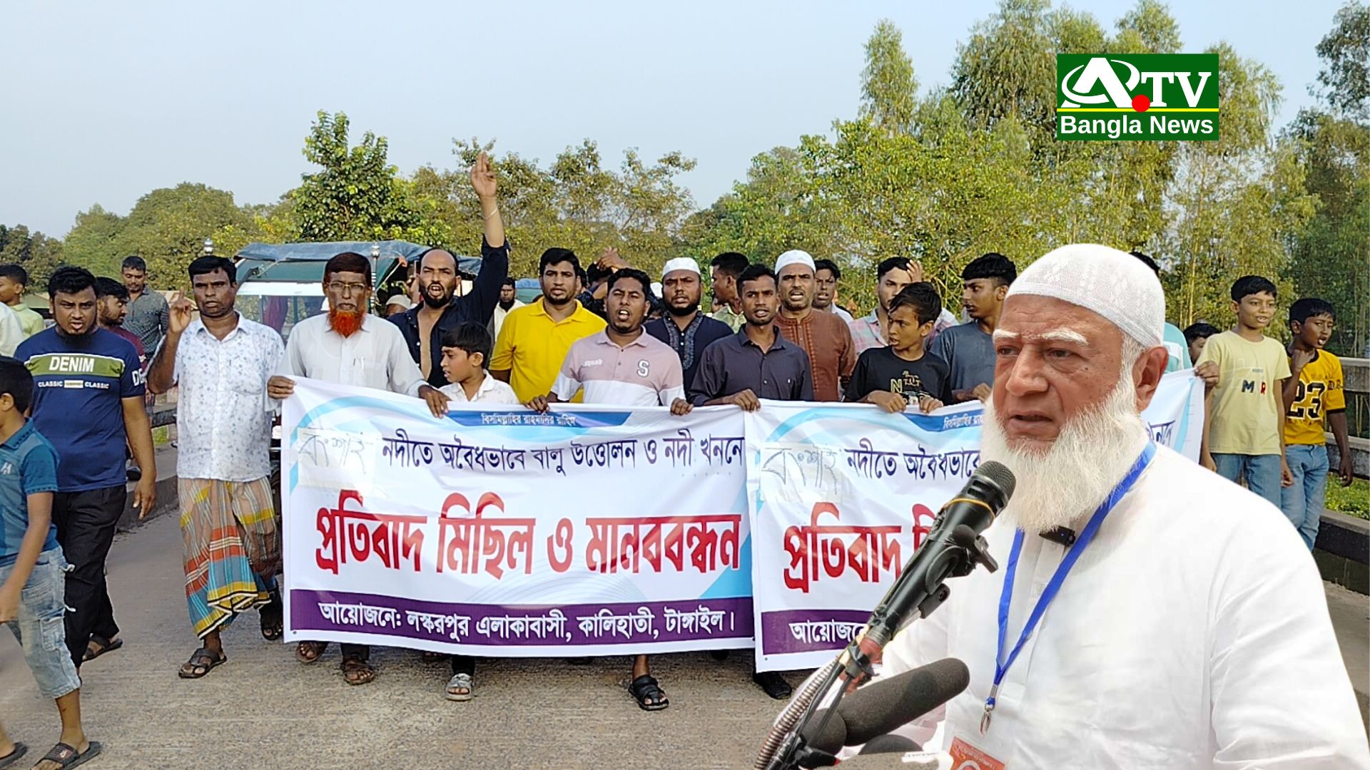 কালিহাতীতে নদীখনন বন্ধে মানববন্ধন ও প্রতিবাদ মিছিল বংশাই নদীতে সরকারি প্রকল্পের মাধ্যমে খনন কাজ বন্ধের দাবিতে টাঙ্গাইলের কালিহাতী উপজেলার নাগবাড়ী